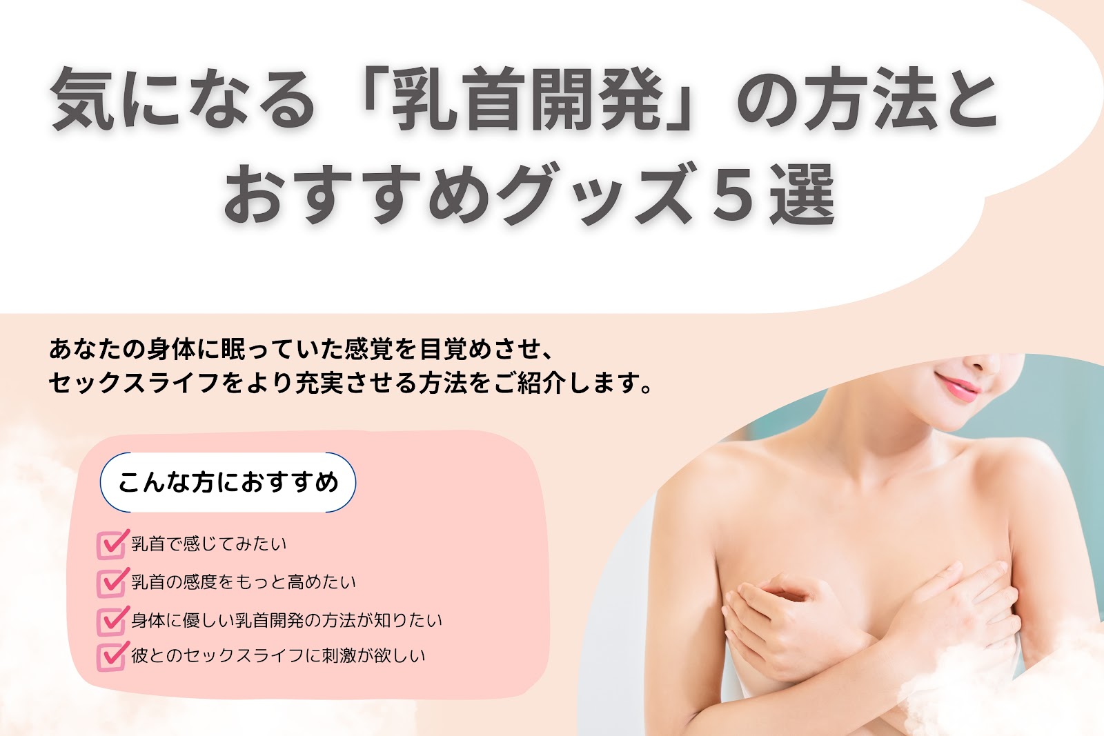 | 乳首で感じてみたい方乳首の感度をもっと高めてみたい方身体に優しい乳首開発の方法が知りたい方パートナーとのセックスライフに刺激が欲しい方 |